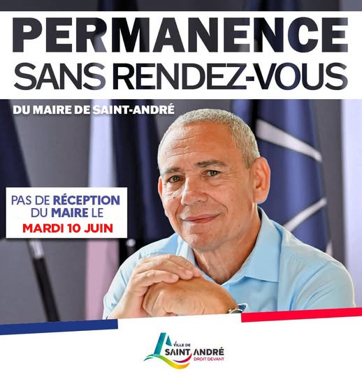 Nous vous informons qu’EXCEPTIONNELLEMENT, le Maire de Saint-André, Monsieur Joé BÉDIER, ne recevra pas les administrés ce mardi 10 JUIN 2025.