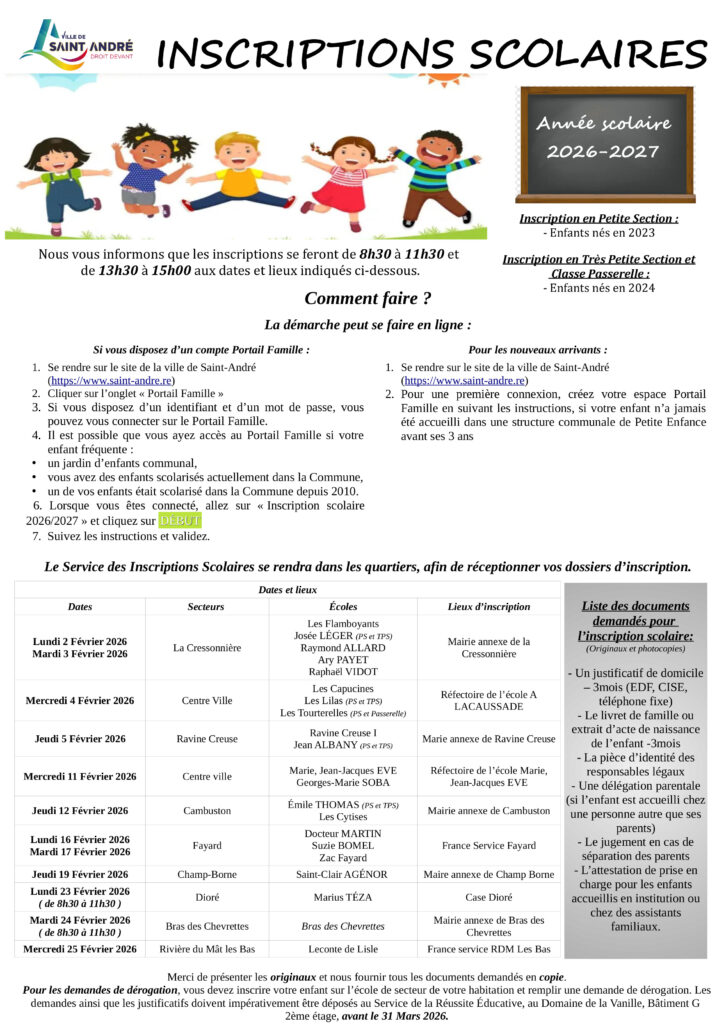 La campagne des inscriptions scolaires 2026-2027 débutera en Février 2026.